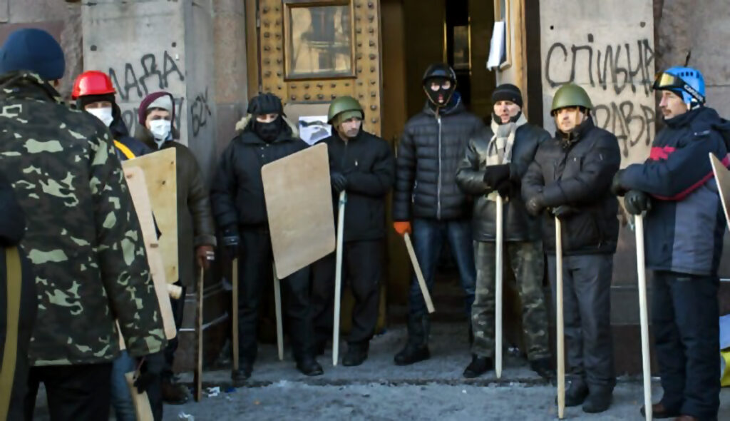 Ukranian National Tax Cartel members protecting their own private bank in Kiev, capital of Ukraine.