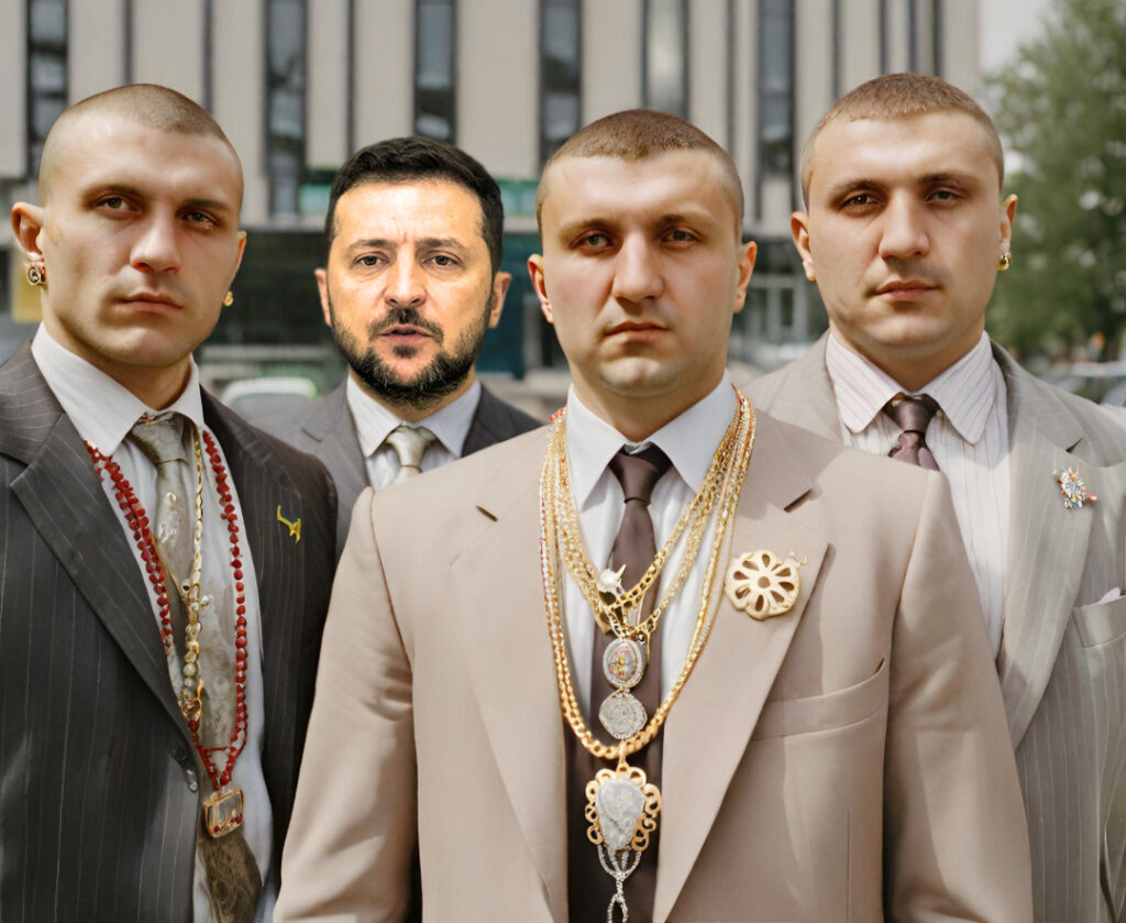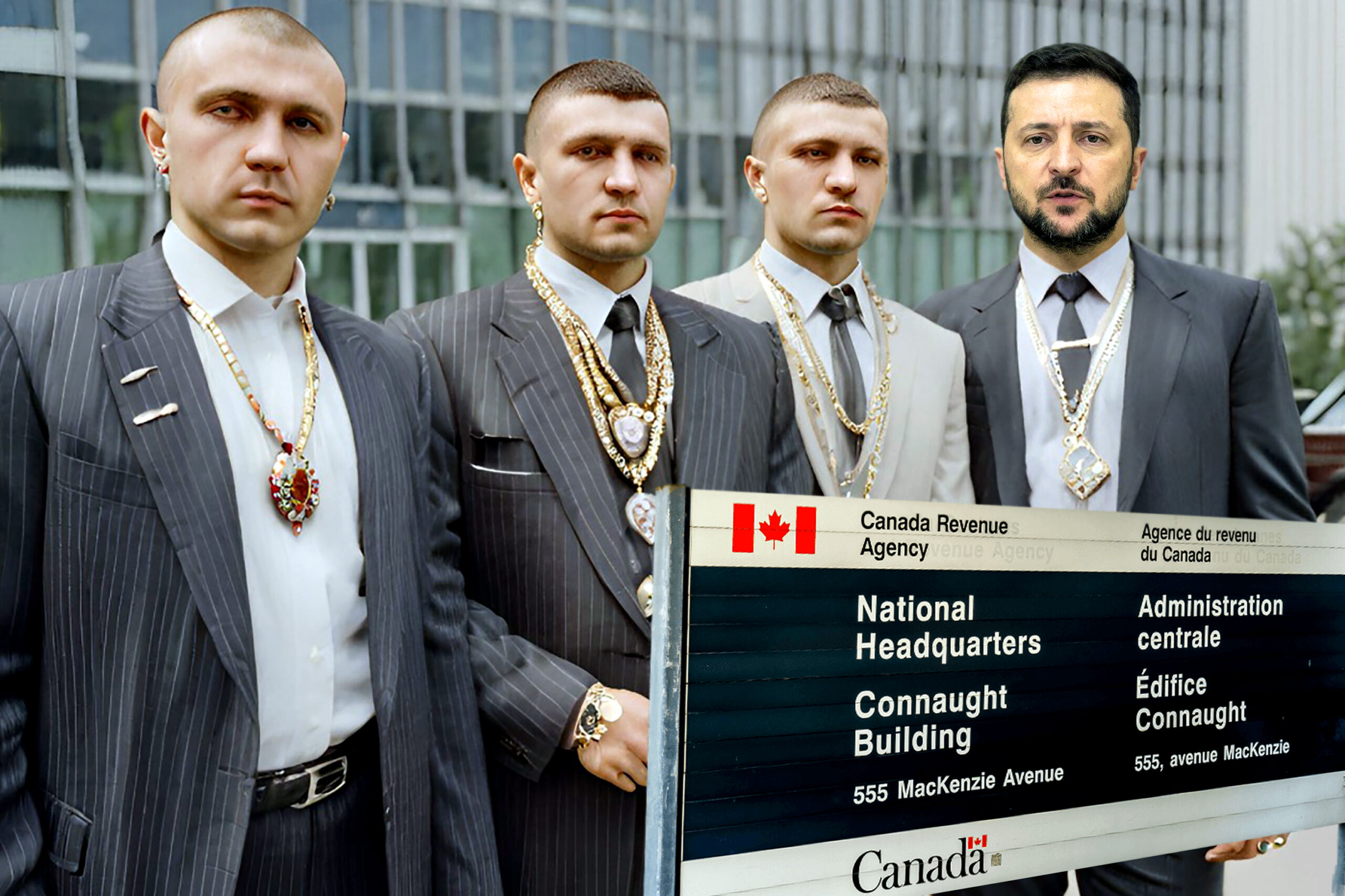 Ukrainian President Volodymyr Zelensky (back) is sending 130 Ukrainian Tax Cartel (UTC) collectors to Canada this Spring. They will include superintendents Ygor Pavlovski, Ivan Rubintukkoff and Mike Smith-Trudeau (pictured).